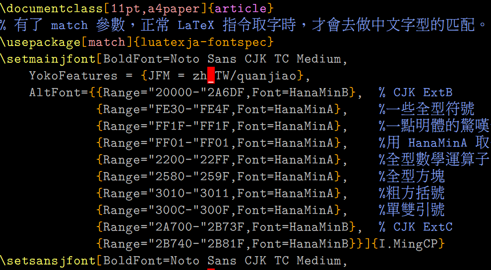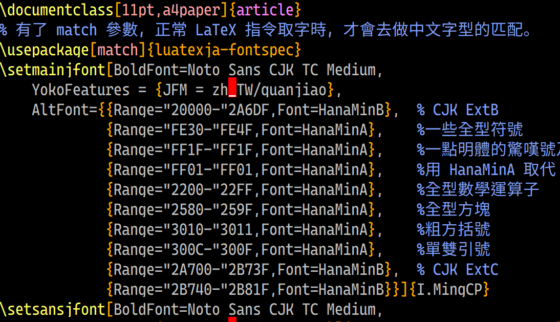 終端機是使用等寬字型,微軟有開發出一套 Cascadia 字型,滿有特色的,但中文字就得使用 fallback 的方式,抓取其他中文字型的字,這樣常常無法完美匹配。 有人把必要的中文也內建了,就是 Cascadia Next 系列,有興趣的人可試試看,這種字是否合「口胃」。 https://github.com/microsoft/cascadia-code/releases/tag/cascadia-next 我個人是使用自行修改的 cwTeXMingMono(網路上找一下應該還可以找到)。 |