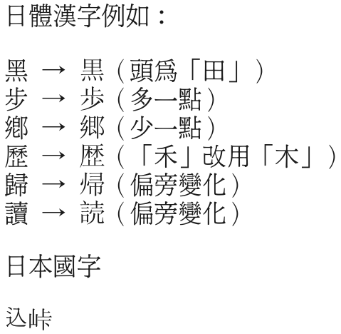 黑 → 黒(頭為「田」) 日本國字(這部份無相對的繁體字對應),例如: 込峠 google 了一下,不得要領,沒有找到完整的。如果有人知道此一對應表,請不吝提供,謝謝! 如果你的字型無法正確顯示,以下是抓圖: