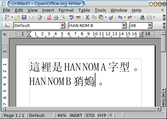 我記得有些版本的 OO.o,把字型裝在 $HOME/.fonts 下的話會抓不到。 不過,提醒一下,HAN NOM 字型依據的是大陸寫法,有些字和我們的繁體寫法並不一樣。請參考: 〈兩岸字體上的差異〉 PS.新版的 fireflysung(odosung) 1.4.2 版已經修正過來了。