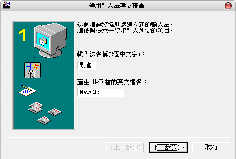 - Windows 使用者請利用 "程式集--附屬應用程式--通用輸入法編輯工具" 來產生 .IME 檔,說明如下: