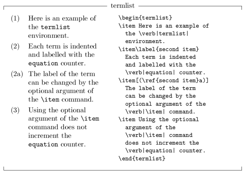 termlist:在非數式下,提供 equation 式的條列環境,他的縮排和 label 和一般的equation 環境相同,但,他不必在數式環境就可以使用,而且編號會自動計算。請看下圖就知道他在做什麼: