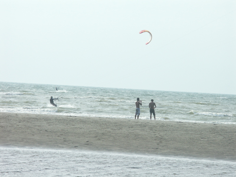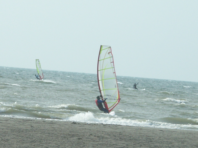 有不少人在玩風浪板(固定在衝浪板上的可轉動的帆)、衝浪(surfing)、還有那種手拉風箏式的風浪板(風箏衝浪板 kitesurfing)。那種手拉風箏式的風浪板好像都是老外在玩,聽他們講話,似乎不是在講英語。也有人玩風箏式的沙灘車。
