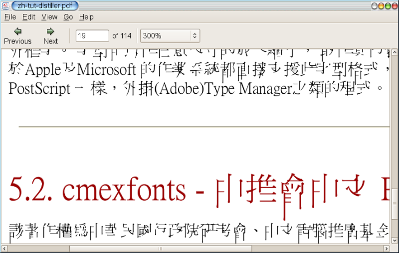 最主要是發生在嵌入字型的 PDF 檔,如果所嵌入的字型是 MS 的新細明或是標楷體,那麼就會發生字變成破碎的情形。原因是,這些字型是用組字方式造字的,要經過 TTF bytecode interpreter 的解譯才能把各筆劃歸位,也才能正常顯示。所以,這類字型,嚴格而論是不適合嵌入 PDF 檔的。所謂的破碎,就如下圖所示,各筆畫並未歸定位: