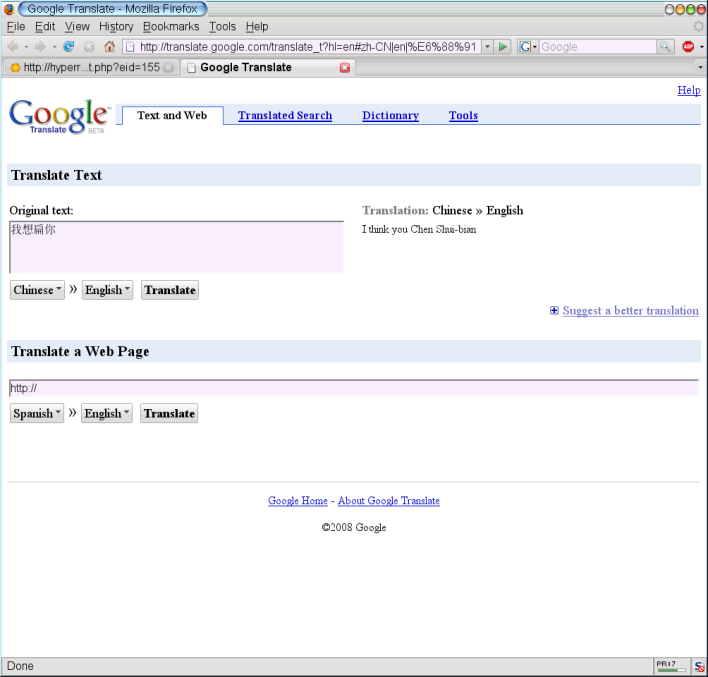 google 搞笑過頭了,小心被扁! http://translate.google.com/translate_t?hl=en#zh-CN|en|%E6%88%91%E6%83%B3%E6%89%81%E4%BD%A0 政治議題的笑話還是要小心一點呀!