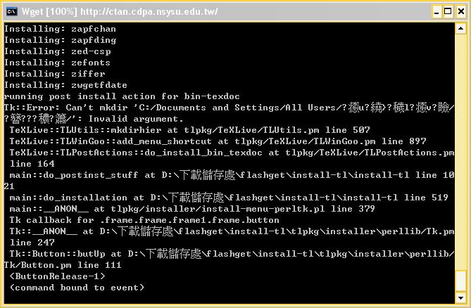 謝謝各位的回應。我也有寄信問 texlive 團隊。得到如下的回音,不知各位懂 Perl 與中文 Windows 特性的前輩能否協助解決此問題? another Chinese reported a similar problem with TeX Live 2007 which had a completely different installer. In order to avoid the problem