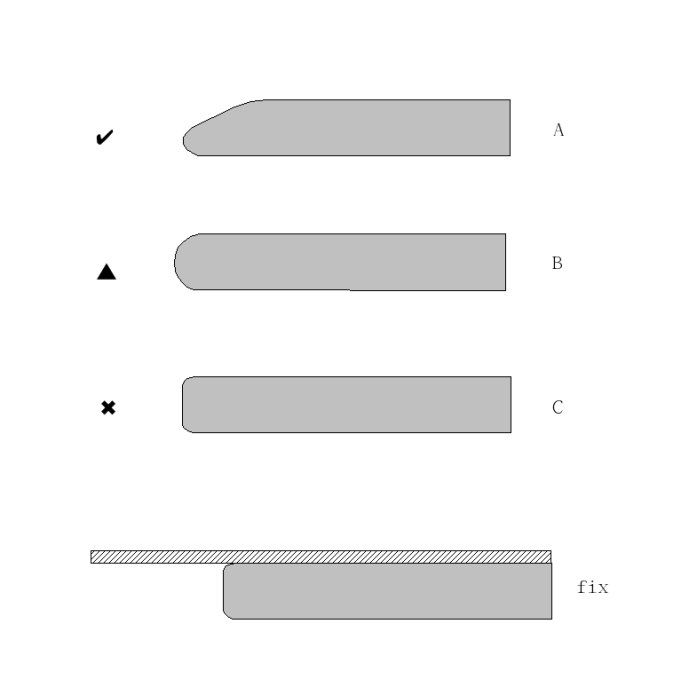 目前電腦桌 or 辦公桌的邊緣有如圖 ABC 三種,A 是最好的,B次之, C是最爛的設計,我們公司的隔間的桌面就是採用這一種。