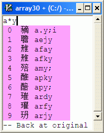 Hi, I just added 行列輸入法 支援 ... after >3 hours intensive work. It started to work for me, as you can find from http://maxiangjiang.googlepages.com/vimim_wildcard_search_array30.gif It may be available "officially" within one week, after more testing and clean up document http://maxiangjiang.googlepages.com/vimim.html The data file is modified from 行列對照表文字檔(Unicode 20902字、UTF-8 編碼) | |||||||||||||
