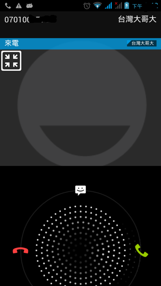 滑動到綠色的電話 icon 就是接聽電話,滑動到紅色就是掛斷。下載Acer 最新的更新會換成浮動的小畫面的,我是改回全螢幕的。